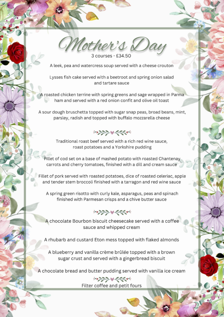 Treat your mum and all the family to a delicious Mother’s Day lunch at Lysses with our special 2 or 3 course lunch on Sunday 19th March. Sittings at 12 noon and 3pm. Booking essential