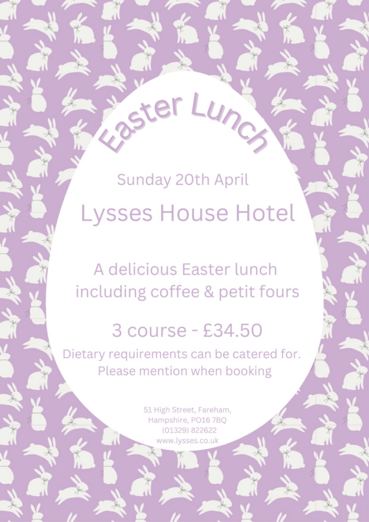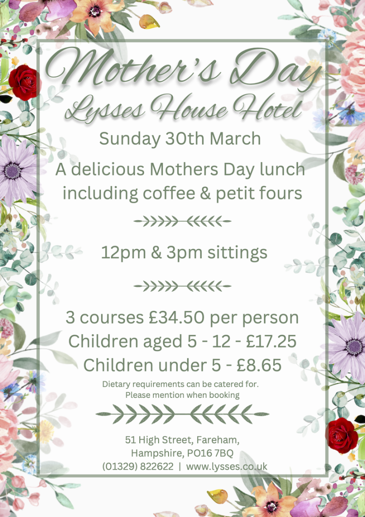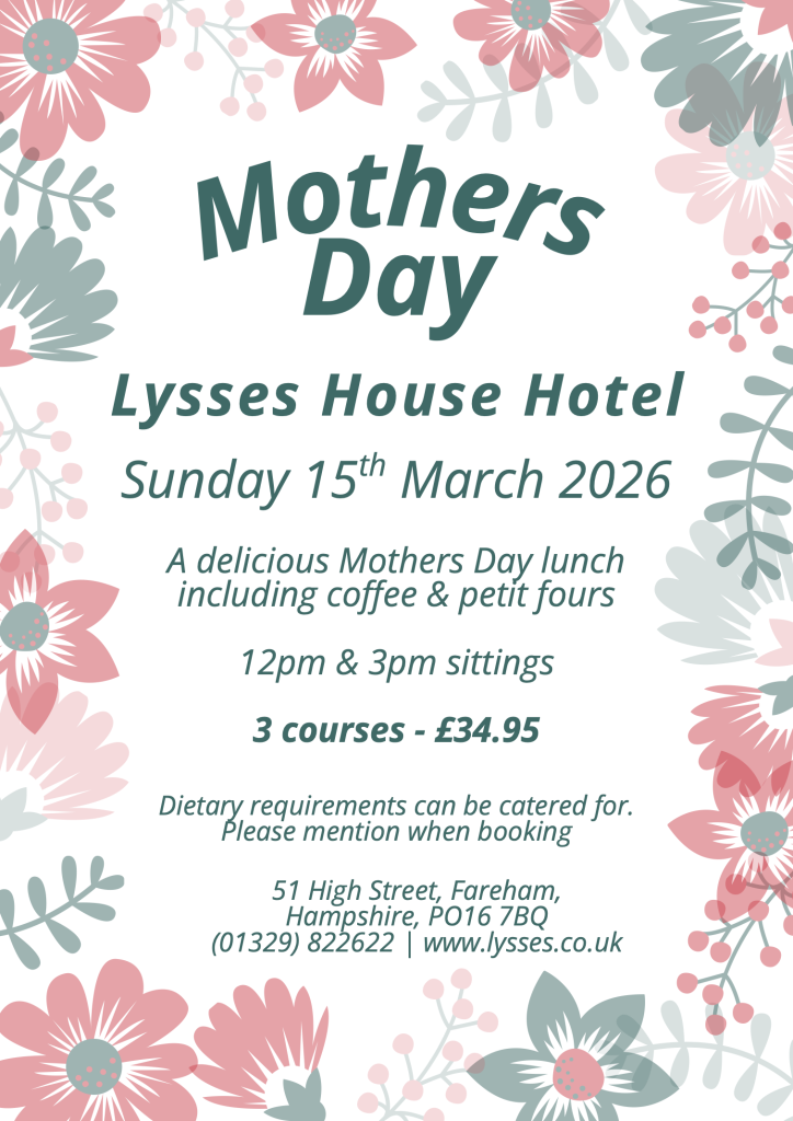 Treat your mum and all the family to a delicious Mother’s Day lunch at Lysses with our special 2 or 3 course lunch on Sunday 30th March. Sittings at 12 noon and 3pm. Booking essential