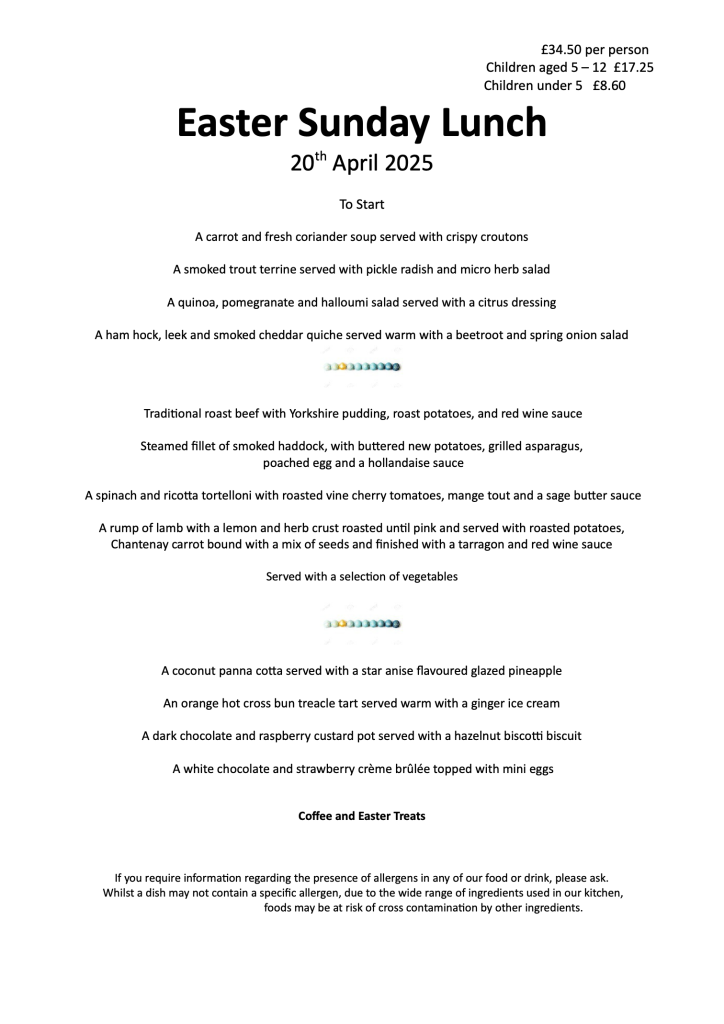 Come and celebrate Easter with us and enjoy a three course Sunday lunch followed by coffee and petit fours.