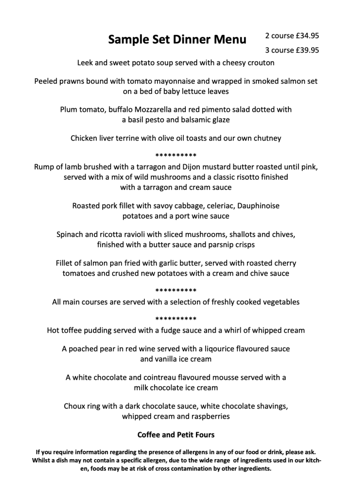Enjoy a delicious 3 course meal including freshly brewed coffee and petit fours – or why not stay the night to turn it into an extra special occasion?