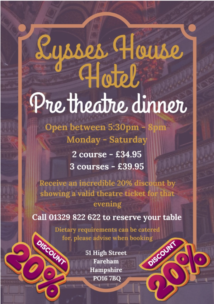 Get 20% off your 2 or 3 course dinner when you show valid Fareham Live theatre tickets